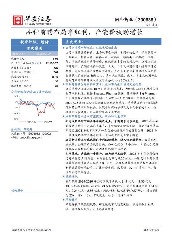 基于公司在高端市场的深耕、专利悬崖带来的机遇、新品种的快速放量以及产能的有效提升,首次覆盖给予同和药业“增持”评级。