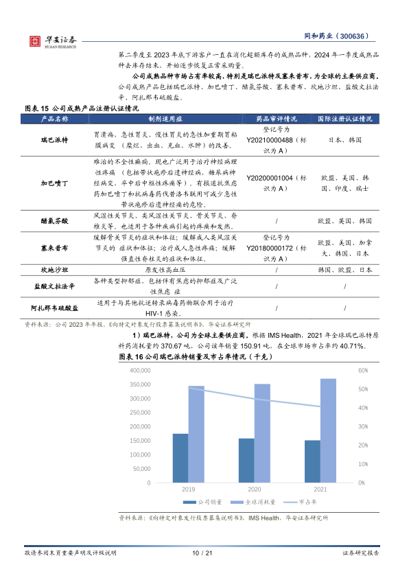 2023年,受下游客户去库存影响,公司医药原料药收入同比下降5.42%,但中间体产品销售额同比增长21.46%,主要得益于高毛利率定制类品种的增长。根据公司公告,成熟品种的下游去库存已在2024年第一季度结束,采购需求正逐步恢复正常。公司在多个成熟品种领域拥有较高的市场占有率,是全球主要供应商之一: