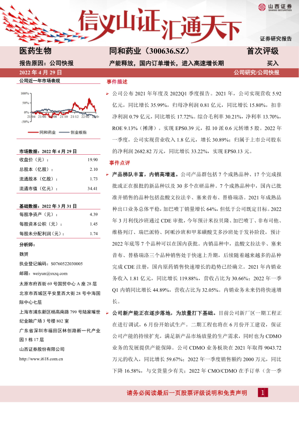 同和药业发布2021年年度及2022年一季度报告,业绩表现良好,内销业务高速增长。公司产品梯队丰富,新产能逐步落地,为未来业绩放量打下基础。