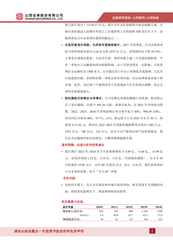 预计公司2022年~2024年实现销售收入8.09亿、11.60亿.、15.99亿元,实现净利润1.25亿、2.18亿、3.25亿。以4月29日收盘价19.90元计,对应PE分别为33.3、19.1、12.8倍,给予“买入-B”评级。