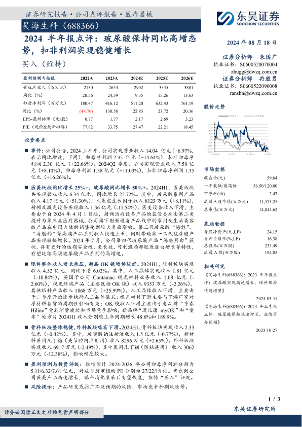 昊海生科2024年半年度报告显示,公司医美业务表现强劲,尤其是玻尿酸产品线,成为业绩增长的主要驱动力。眼科业务受到集采政策的影响,但新品表现良好,有望缓解部分压力。维持对公司未来盈利的乐观预期,以及“买入”评级。投资者应关注产品研发和市场竞争等风险。