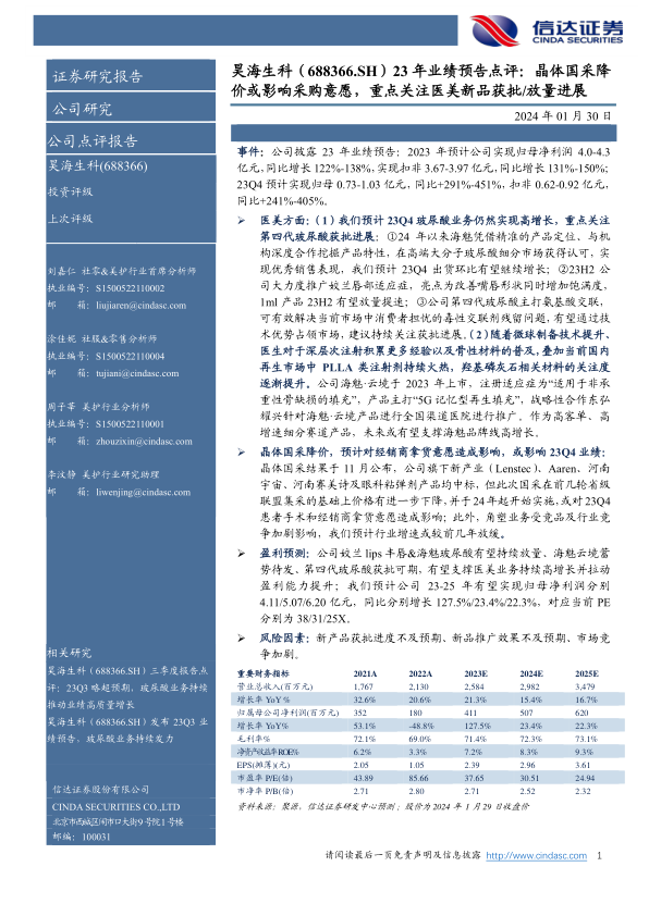 本报告分析了昊海生科2023年业绩预告,认为医美业务具有增长潜力,但晶体国采降价可能带来影响。维持公司盈利预测,但提醒投资者关注新产品风险和市场竞争。