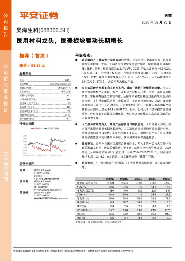 投资建议:公司作为国内优质医疗器械企业,两大主营产品为人工晶体和玻尿酸填充材料,选取爱博医疗、爱美客、华熙生物作为可比公司,2025年可比公司平均估值28倍,我们预计公司2024/2025/2026年分别实现归母净利润4.2、5.2、6.4亿元,首次覆盖给予“推荐”评级。