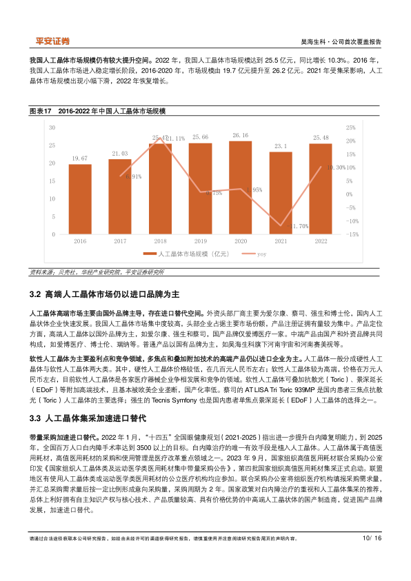 昊海生科作为国内生物医用材料领域的创新型领导者,其核心竞争力体现在多元化的产品布局和持续的研发创新能力。公司两大核心产品——玻尿酸和人工晶状体——是其业绩增长的主要驱动力。医美板块,特别是高端玻尿酸产品“海魅”的强劲增长,预示着该领域将成为公司未来重要的增长引擎。在人工晶体市场,受益于人口老龄化带来的白内障手术需求增长和国家带量采购政策下进口替代的加速,公司有望进一步扩大市场份额。此外,骨科和防粘连及止血产品线也保持了较高的市场地位。