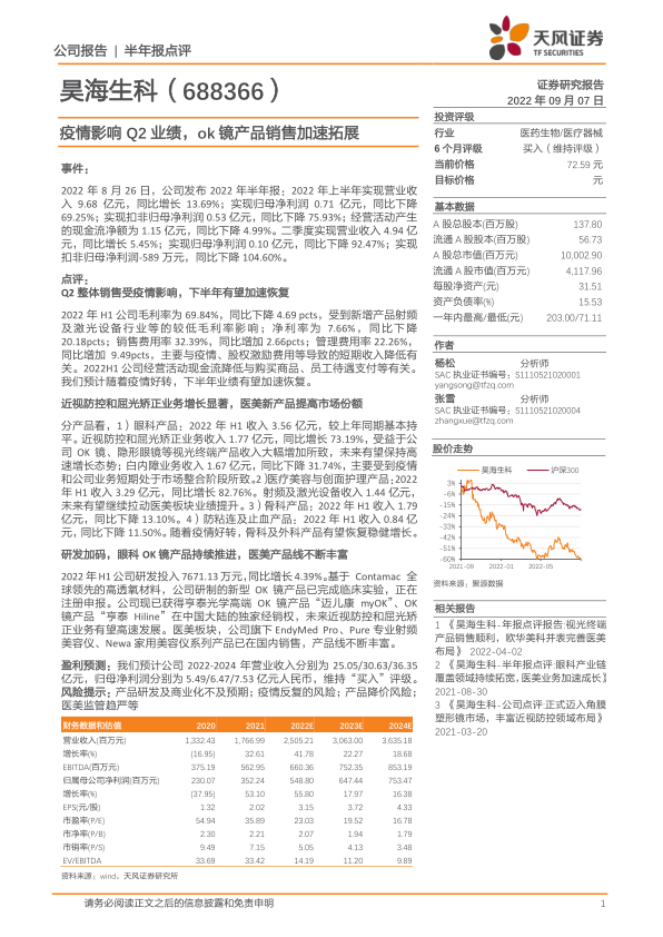 本报告对昊海生科(688366)2022年半年报进行了分析,核心观点如下: