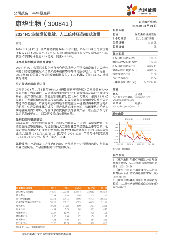 康华生物2024年上半年业绩表现稳健,得益于核心产品销售和海外授权合作。人二倍体狂苗的持续放量有望推动公司业绩进一步增长。维持此前盈利预测,维持“买入”评级。同时,报告也提示了产品研发、销售、政策以及产品结构等方面的风险。