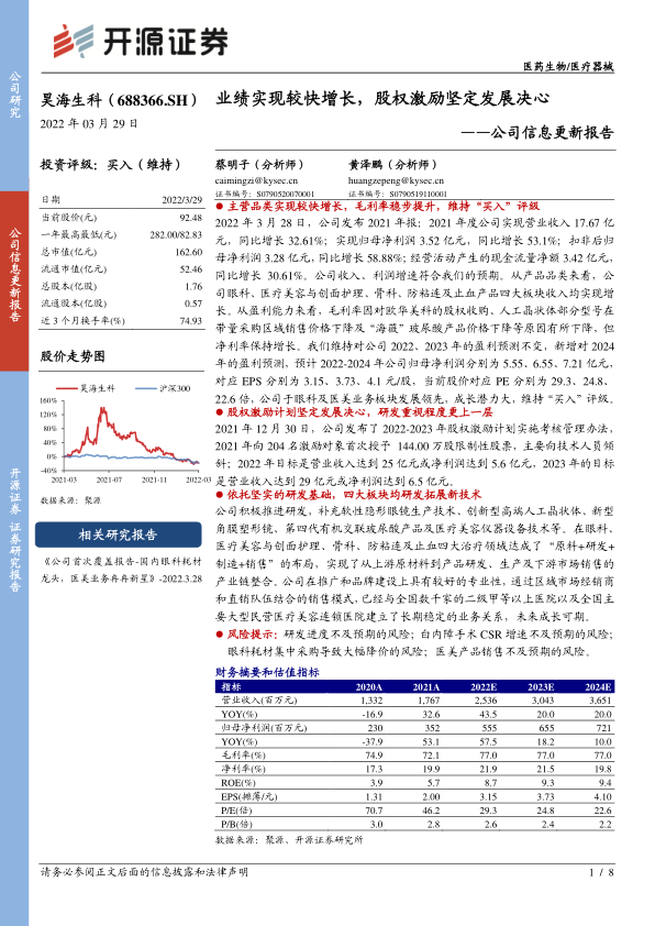 2022年3月28日,公司发布2021年报:2021年度公司实现营业收入17.67亿元,同比增长32.61%;实现归母净利润3.52亿元,同比增长53.1%;扣非后归母净利润3.28亿元,同比增长58.88%;经营活动产生的现金流量净额3.42亿元,同比增长30.61%。公司收入、利润增速符合我们的预期。从产品品类来看,公司眼科、医疗美容与创面护理、骨科、防粘连及止血产品四大板块收入均实现增长。从盈利能力来看,毛利率因对欧华美科的股权收购、人工晶状体部分型号在带量采购区域销售价格下降及“海薇”玻尿酸产品价格下降等原因有所下降,但净利率保持增长。我们维持对公司2022、2023年的盈利预测不变,新增对2024年的盈利预测,预计2022-2024年公司归母净利润分别为5.55、6.55、7.21亿元,对应EPS分别为3.15、3.73、4.1元/股,当前股价对应PE分别为29.3、24.8、22.6倍,公司于眼科及医美业务板块发展领先,成长潜力大,维持“买入”评级。