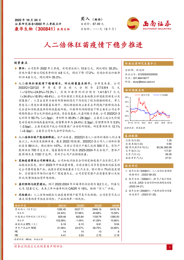 风险提示:人二倍体细胞狂犬病疫苗新增产能节奏不及预期;公司存货不足以满足销售的季节性波动风险;产品结构单一的风险。