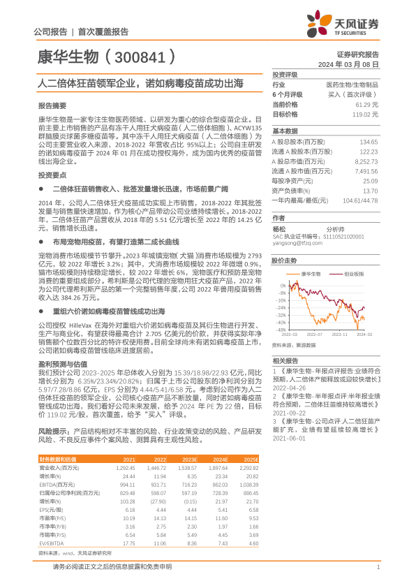 采用可比公司估值法,参考百克生物、康泰生物、沃森生物和智飞生物等可比公司2024年PE估值均值22.27X。考虑到康华生物作为人二倍体狂苗的领军企业,核心疫苗产品持续放量,且诺如病毒疫苗管线成功出海,看好公司未来发展。给予公司2024年22倍PE,目标价119.02元/股,首次覆盖给予“买入”评级。