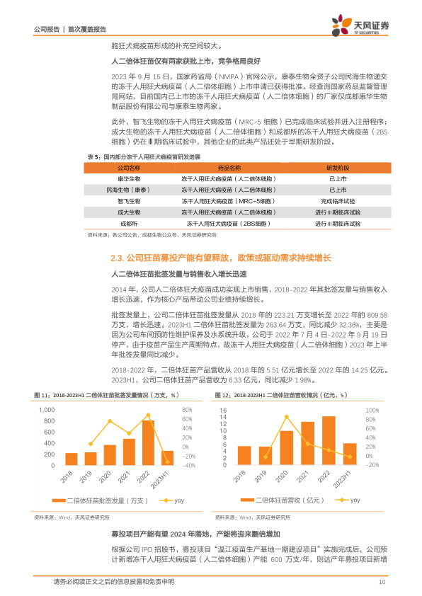 康华生物人二倍体狂苗批签发量和销售收入增长迅速,2018-2022年营收从5.51亿元增至14.25亿元。2023年上半年批签发量同比减少32.36%,主要系车间预防性维护保养及水系统升级导致停产。公司IPO募投项目“温江疫苗生产基地一期建设项目”预计新增HDCRV产能600万支/年,有望于2024年12月31日达到预定可使用状态,届时公司该产品产能将翻倍,进一步打开销售空间。此外,国家疾控局2023年9月颁布的《狂犬病暴露预防处置工作规范(2023年版)》提出狂犬病预防处置门诊应配备至少两种不同种类的狂犬病疫苗,有望进一步带动狂苗整体需求,康华生物作为人二倍体狂苗领军企业将受益。