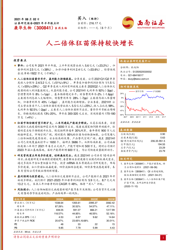 康华生物2021年半年报显示,公司业绩增长主要受益于人二倍体狂犬疫苗的量价齐升。公司通过产能扩张和市场布局,有望进一步扩大市场份额。同时,公司积极布局多价疫苗研发,有望为公司贡献新的业绩增长点。维持“买入”评级,但需关注产能释放节奏、存货风险和产品结构单一风险。