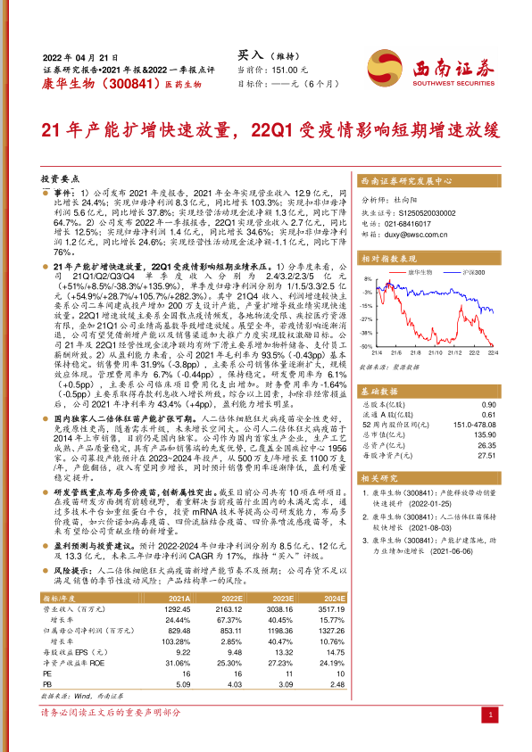 康华生物2021年业绩亮眼,主要受益于产能扩张。2022年一季度受疫情影响增速放缓,但长期来看,公司凭借人二倍体狂犬病疫苗的独家优势和多价疫苗的研发管线,未来增长潜力巨大。维持“买入”评级,但需关注产能释放、存货管理和产品结构单一等风险。