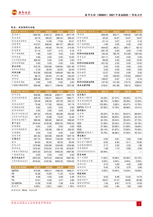本报告分析了康华生物2021年年报和2022年一季报,核心观点如下:
