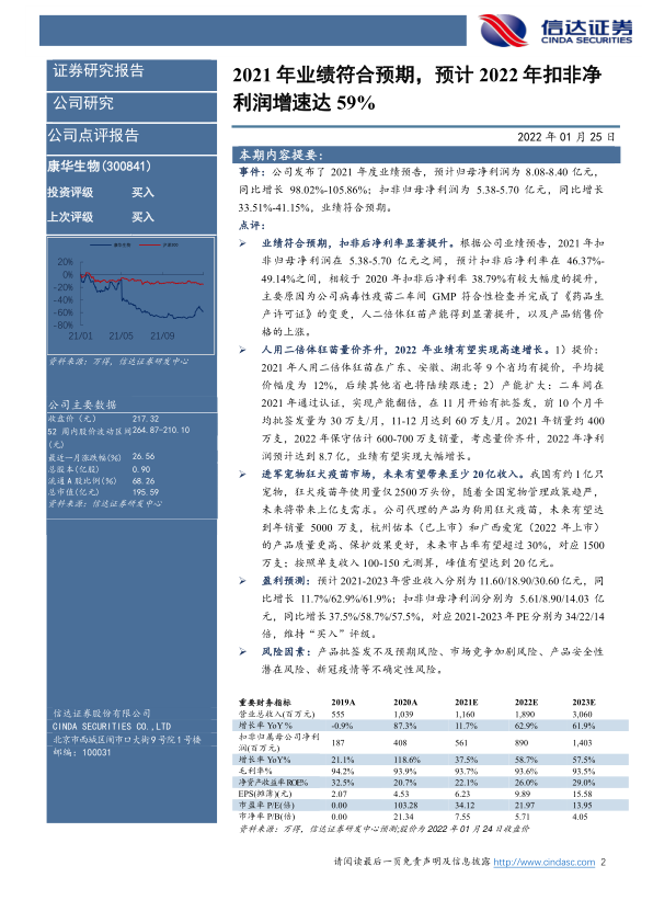 业绩符合预期, 扣非后净利率显著提升。 根据公司业绩预告, 2021 年扣非归母净利润在 5.38-5.70 亿元之间, 预计扣非后净利率在 46.37%-49.14%之间,相较于 2020 年扣非后净利率 38.79%有较大幅度的提升,主要原因为公司病毒性疫苗二车间 GMP 符合性检查并完成了《药品生产许可证》的变更,人二倍体狂苗产能得到显著提升,以及产品销售价格的上涨。