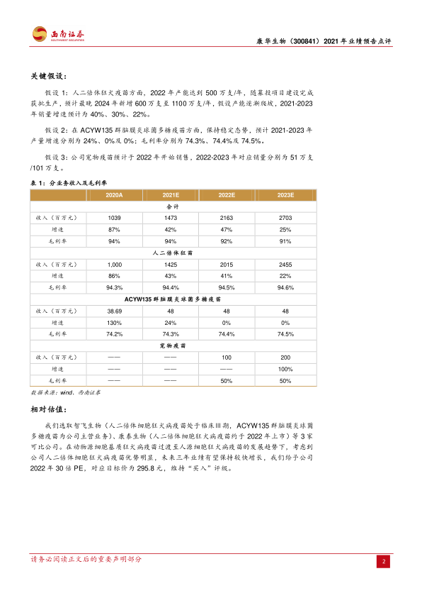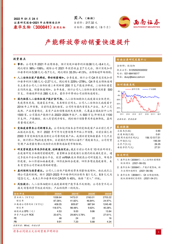 本报告对康华生物2021年业绩预告进行了深入分析,认为公司业绩增长主要受益于人二倍体狂苗产能释放,并对公司未来发展前景持乐观态度。