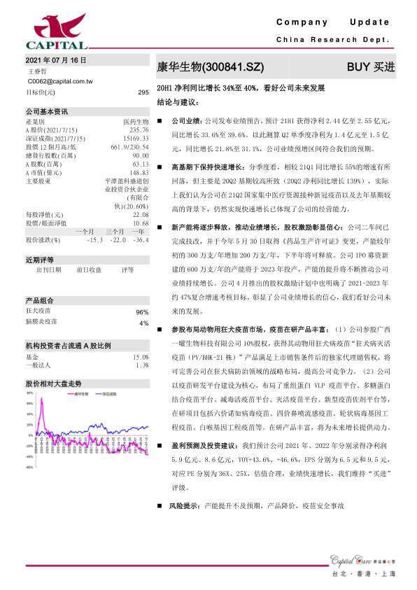 本报告分析了康华生物2021年上半年的业绩预告,认为公司在高基数下仍保持快速增长,体现了其经营能力。公司通过技改和新建产能,不断提升疫苗生产能力,并通过参股公司布局动物疫苗市场,为未来业绩增长提供动力。此外,公司还积极进行疫苗研发,为未来增长提供更多可能性。维持“买进”评级,但同时也提示了产能提升不及预期、产品降价以及疫苗安全事故等风险。