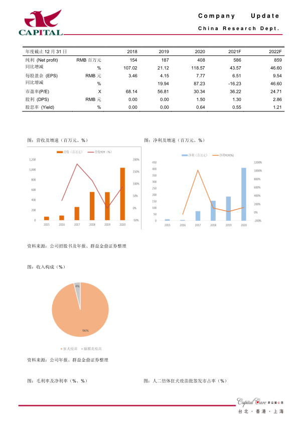 参股布局动物用狂犬疫苗市场,疫苗在研产品丰富:(1)公司参股广西一曜生物科技有限公司10%股权,获得其动物用狂犬病疫苗“狂犬病灭活疫苗(PV/BHK-21株)”产品满足上市销售条件后的独家代理销售权,将可完善公司在狂犬病防治领域的战略布局,提高公司竞争力。(2)公司以疫苗研发平台建设为核心,布局了重组蛋白VLP疫苗平台、多糖蛋白结合疫苗平台、减毒活疫苗平台、灭活疫苗平台、新型疫苗佐剂平台等,在研项目包括六价诺如病毒疫苗、四价鼻喷流感疫苗、轮状病毒基因工程疫苗、白喉基因工程疫苗等。在研产品丰富,将为未来增长提供动力。