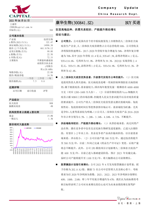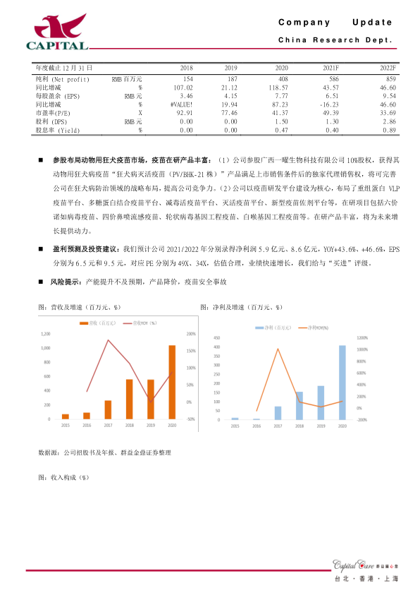 公司简介: 公司是国内首个经中检院批签发上市销售的人二倍体狂犬病疫苗生产企业,人二倍体狂犬疫苗销售占公司总营收的 96%。 公司营收及净利保持快速增长, 2017-2020 年营收年复合增速为 58%,净利年复合增速为 76%,其中 2020 年营收 10.4 亿元,YOY+87.3%,录得净利润 4.1 亿元,YOY+118.6%,毛利率为 93.9%,净利率为 39.3%。 2021Q1 实现营收 2.4亿元, YOY+51.0%,录得净利 1.0 亿元, YOY+54.9%,毛利率为 93.3%,净利率为 42.4%。