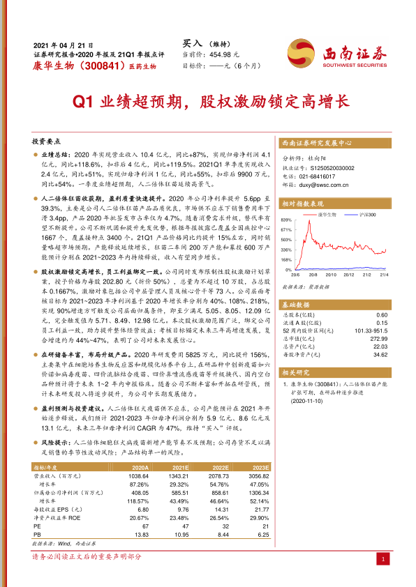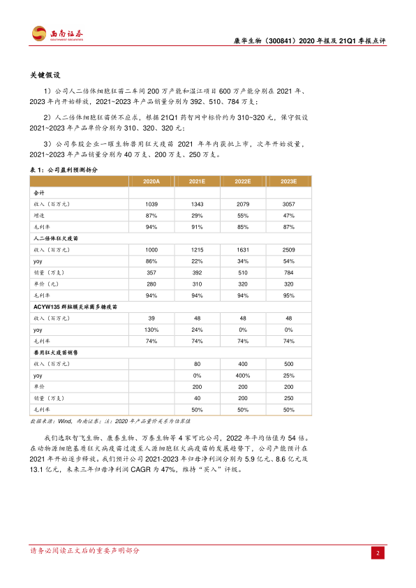 康华生物凭借其核心产品人二倍体狂犬疫苗的强劲市场需求和卓越盈利能力,在2020年及2021年第一季度实现了显著的业绩增长。公司通过产能扩张、股权激励计划以及持续的研发投入,为未来的高速发展奠定了坚实基础。尽管存在产能释放、存货管理和产品结构单一等风险,但鉴于其明确的增长路径和创新疫苗的布局,公司未来三年的盈利能力预计将持续提升,维持“买入”评级。
