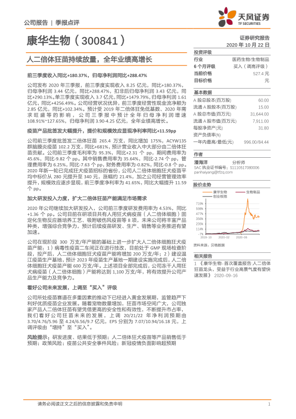 康华生物在2020年前三季度展现出卓越的业绩增长,营业收入和归母净利润同比分别增长180.37%和288.47%,主要得益于其核心产品人二倍体狂犬疫苗批签发量的175%增长、产品平均中标价21.4%的提升以及期间费用率9.82个百分点的下降,共同推动净利率大幅提升11.59个百分点至41.65%。公司持续加大研发投入,前三季度研发费用率同比增加1.36个百分点,并积极推进产能扩张,计划将人二倍体狂犬疫苗总产能提升至1,100万支/年,以满足市场需求并增强竞争力。鉴于疫苗行业进入黄金发展期以及公司核心产品的显著优势,分析师上调了公司未来三年的盈利预测,并将其投资评级由“增持”上调至“买入”,但同时提示了研发、销售、政策及公共安全等方面的潜在风险。