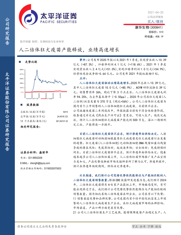 目前人二倍体狂犬疫苗供不应求, 技改完成后,预计人二倍体细胞狂犬病疫苗产能达到 500 万支, 温江一期顺利完工后,产能进一步提升,驱动业绩快速增长, 从长期看,公司凭借销售渠道优势和品牌优势以及工艺成熟产能稳定优势,处于市场领先地位。 我们预计 21-23 年对应 EPS 为 9.59、 14.33、 21.86 元,现价对应 21-23 年 PE 为 43倍、 28 倍、 19 倍,成长性高,首次覆盖, 给予“推荐”评级。