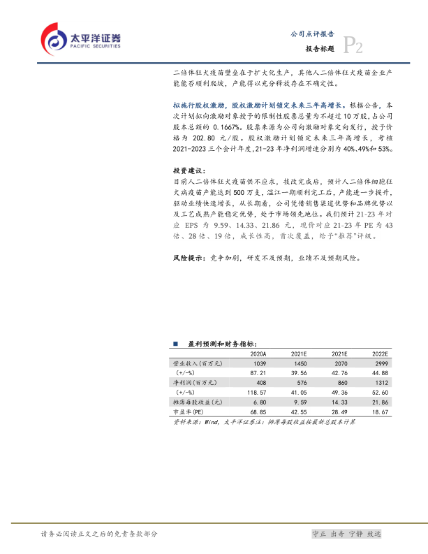 2)公司人二倍体狂苗生产工艺成熟,能够保障疫苗产品稳定生产。 人二倍体狂犬疫苗壁垒在于扩大化生产,其他人二倍体狂犬疫苗企业产能能否顺利爬坡,产能得以充分释放存在不确定性。拟施行股权激励, 股权激励计划锁定未来三年高增长。 根据公告, 本次计划拟向激励对象授予的限制性股票总量为不超过 10 万股,占公司股本总额的 0.1667%。 股票来源为公司向激励对象定向发行, 授予价格为 202.80 元/股。 股权激励计划锁定未来三年高增长, 考核2021-2023 三个会计年度, 21-23 年净利润增速分别为 40%、49%和 53%。