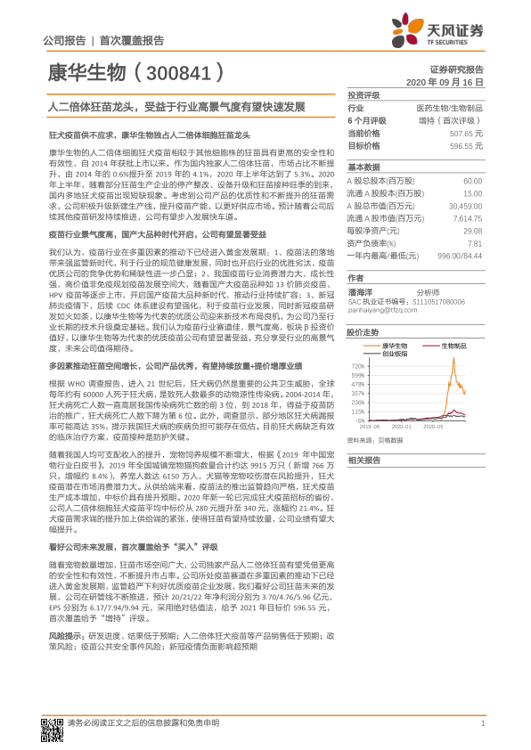 预计康华生物2020/2021/2022年净利润分别为3.70/4.76/5.96亿元,EPS分别为6.17/7.94/9.94元。采用绝对估值法,给予2021年目标价596.55元,首次覆盖给予“增持”评级。