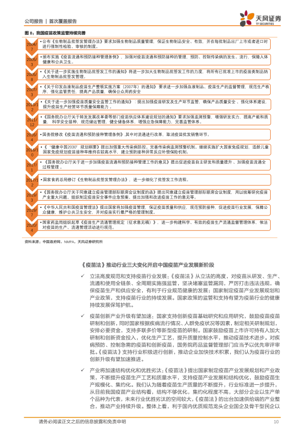 《中华人民共和国疫苗管理法》的落地,从立法高度对疫苗全周期实施强监管,推动行业规范健康发展,降低公共安全事件发生几率。该法支持疫苗创新升级,鼓励多联多价等新型疫苗研制,并对急需和创新疫苗优先审评审批。同时,它将加速产业结构优化和优胜劣汰,推动疫苗生产规模化、集约化,利好国内优质规范的龙头企业和创新型疫苗企业。