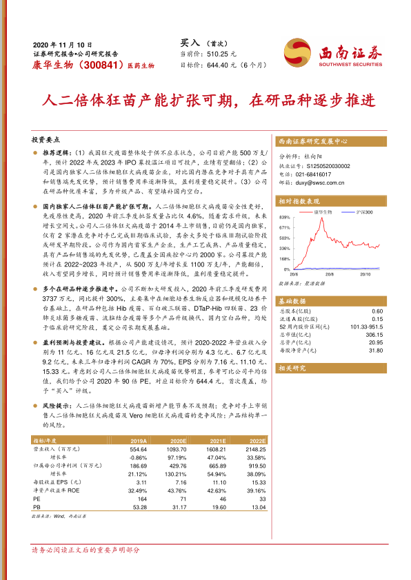 盈利预测与投资建议。根据公司产能建设情况,预计2020-2022年营业收入分别为11亿元、16亿元及21.5亿元,归母净利润分别为4.3亿元、6.7亿元及9.2亿元,未来三年归母净利润CAGR为70%,EPS分别为7.16元、11.10元、15.33元。考虑到公司人二倍体细胞狂犬病疫苗优势明显,参考可比公司平均估值,我们给予公司2020年90倍PE,对应目标价为644.4元,首次覆盖,给予“买入”评级。