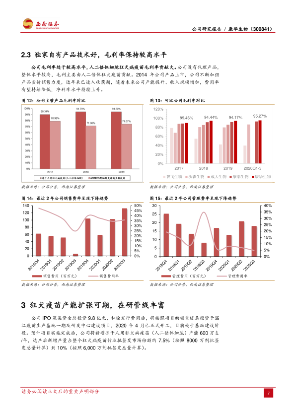 国内独家人二倍体狂苗产能扩张可期。人二倍体细胞狂犬病疫苗安全性更好,免疫原性更高,2020年前三季度批签发量占比仅4.6%,随着需求升级,未来增长空间大。公司人二倍体狂犬病疫苗于2014年上市销售,目前仍是国内独家,仅有2家潜在竞争对手已完成Ⅲ期临床试验,其余大多处于临床Ⅲ期试验阶段或研发早期阶段。公司作为国内首家生产企业,生产工艺成熟、产品质量稳定,具有产品和销售端的先发优势,已覆盖全国疾控中心约2000家。公司募投产能预计在2022~2023年投产,从500万支/年增长至1100万支/年,产能翻倍,收入有望同步增长,同时预计销售费用率逐渐降低,盈利质量稳定提升。