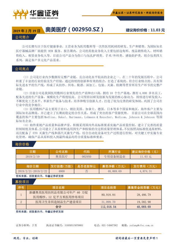 新股询价报告:奥美医疗