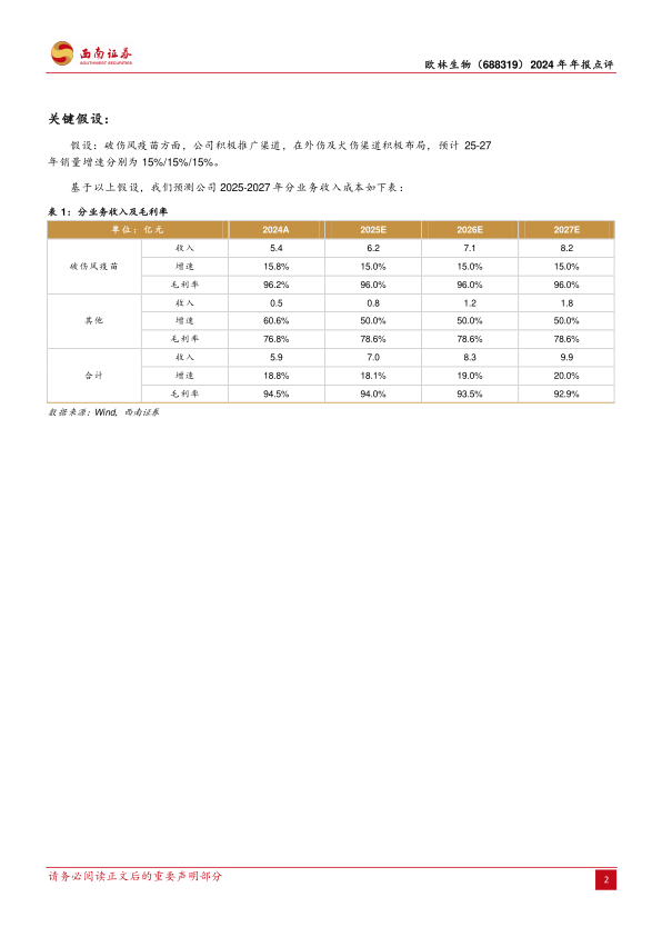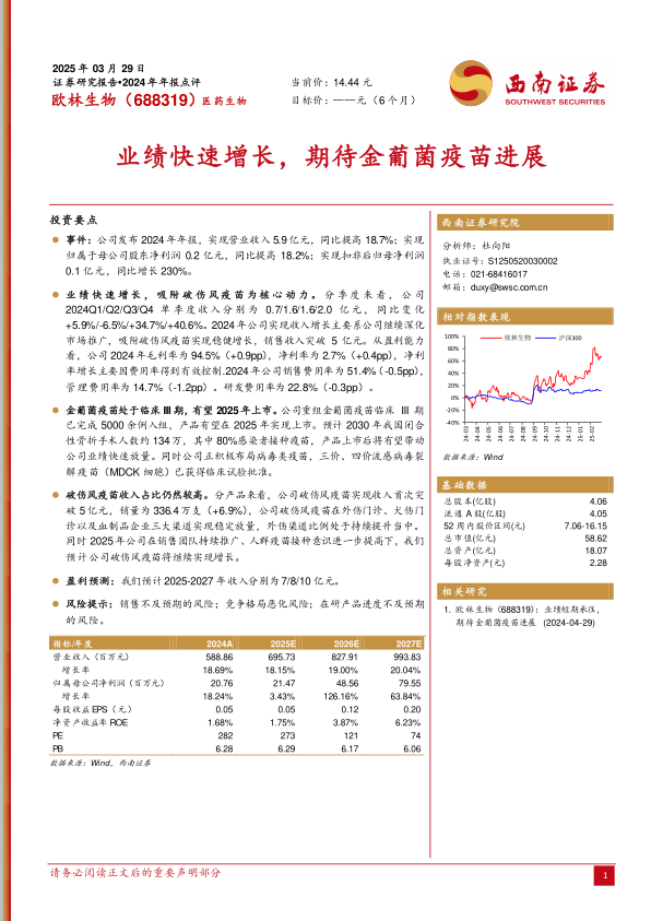 本报告对欧林生物2024年年报进行了全面分析,认为公司业绩快速增长主要得益于核心产品吸附破伤风疫苗的稳健增长。金葡菌疫苗的上市有望为公司带来新的增长动力。同时,公司盈利能力有所提升,费用控制有效。报告还对公司未来收入进行了预测,并提示了相关风险。