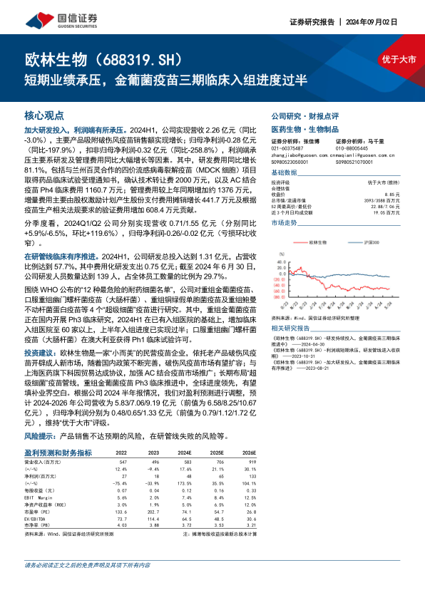 欧林生物被评估为一家“小而美”的民营疫苗企业。公司依托老产品破伤风疫苗开辟成人新市场,随着国内政策完善,市场有望扩容。与上海医药旗下科园贸易达成协议,加强AC结合疫苗市场推广。长期来看,公司布局的“超级细菌”疫苗管线,特别是重组金葡菌疫苗Ph3临床推进中,全球进度领先,有望填补业界空白。基于2024年半年报情况,国信证券对盈利预测进行调整,预计2024-2026年公司营收分别为5.83/7.06/9.19亿元,归母净利润分别为0.48/0.65/1.33亿元,维持“优于大市”评级。