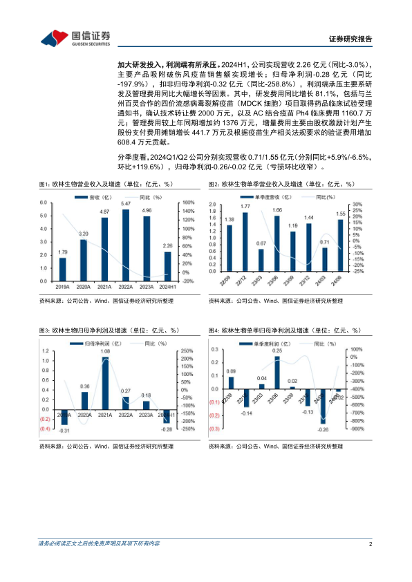 2024年上半年,欧林生物实现营业收入2.26亿元,同比下降3.0%。其中,主要产品吸附破伤风疫苗销售额实现增长。归属于母公司股东的净利润为-0.28亿元,同比下降197.9%;扣除非经常性损益后的归母净利润为-0.32亿元,同比下降258.8%。