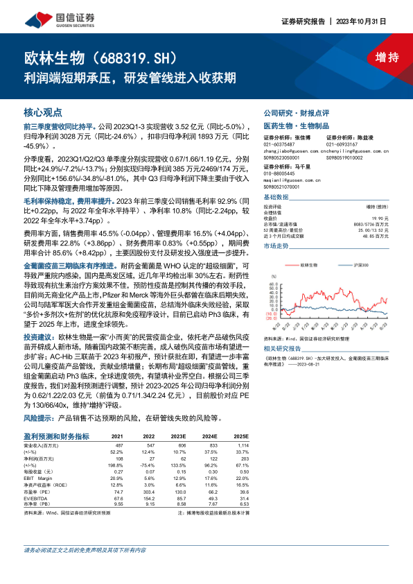 欧林生物在2023年前三季度面临利润端短期承压,主要受收入下降和研发、管理费用投入增加的影响。然而,公司在研发方面的持续高投入正逐步进入收获期,特别是重组金葡菌疫苗的全球领先进展和AC-Hib三联苗的即将获批,预示着未来业绩增长的强劲潜力。结合现有产品市场拓展,公司多产品线布局有望驱动长期发展,分析师维持“增持”评级,但提示产品销售和在研管线失败的风险。
