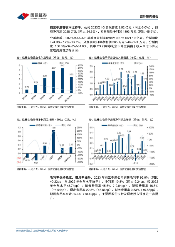 欧林生物2023年前三季度营收同比略有下降,归母净利润和扣非归母净利润均出现较大幅度下滑,尤其第三季度利润端承压明显。这主要受收入下降及管理费用增加等因素影响。尽管毛利率保持稳定,但销售、管理、研发及财务费用率合计显著上升,反映公司在股份支付和研发投入方面的强度进一步加大。