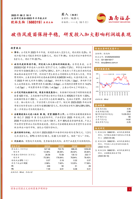 本报告对欧林生物2023年半年报进行了全面分析,认为公司在破伤风疫苗业务保持平稳的基础上,积极投入研发,并发布股权激励计划,彰显了长期发展信心。金葡菌疫苗的上市有望成为公司业绩增长的新动力。维持“买入”评级,但同时也提示了销售不及预期、竞争格局恶化以及研发进度不及预期等风险。