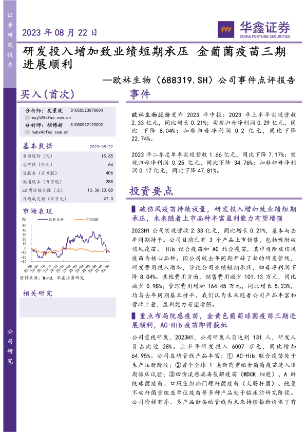 欧林生物(688319.SH)在2023年上半年面临业绩短期承压,主要系公司为拓展未来增长空间而大幅增加研发投入所致。尽管归母净利润同比下降8.04%,但公司核心产品吸附破伤风疫苗持续放量,且在研管线进展顺利,特别是全球1类新药重组金黄色葡萄球菌疫苗已进入Ⅲ期临床试验,AC-Hib联合疫苗即将获批,预示着公司未来盈利能力有望显著增强。