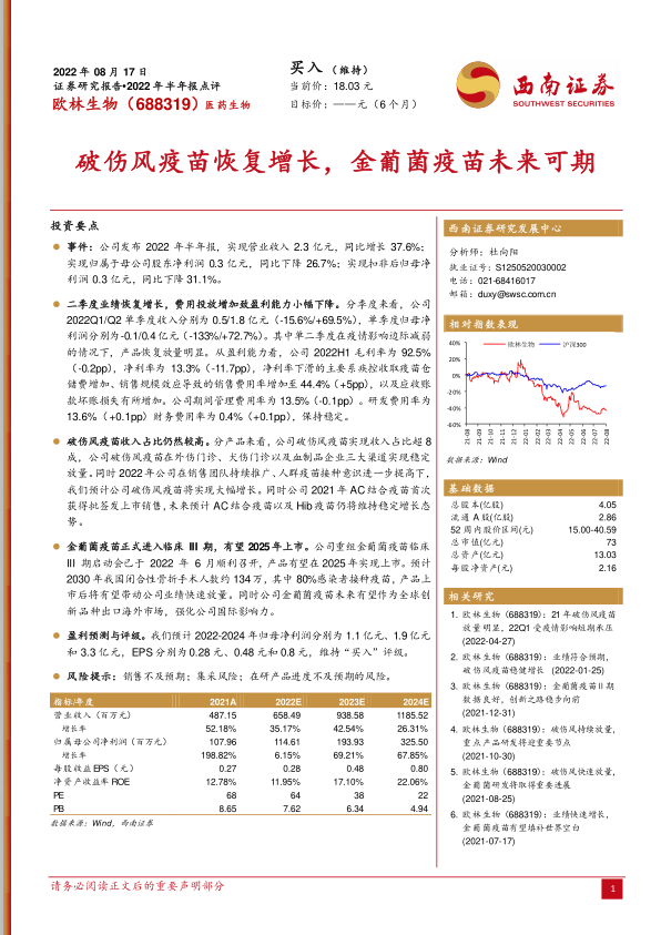 本报告对欧林生物2022年半年报进行了全面分析,公司二季度业绩恢复增长,破伤风疫苗保持稳定增长,金葡菌疫苗未来可期。维持“买入”评级,但同时也提示了销售不及预期、集采风险以及在研产品进度不及预期的风险。