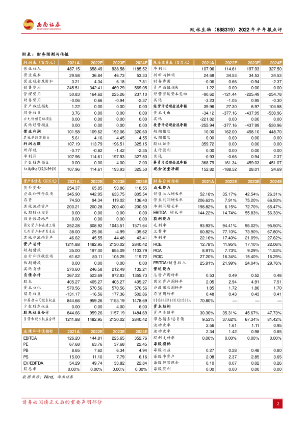 本报告分析了欧林生物(688319)2022年半年报,核心观点如下: