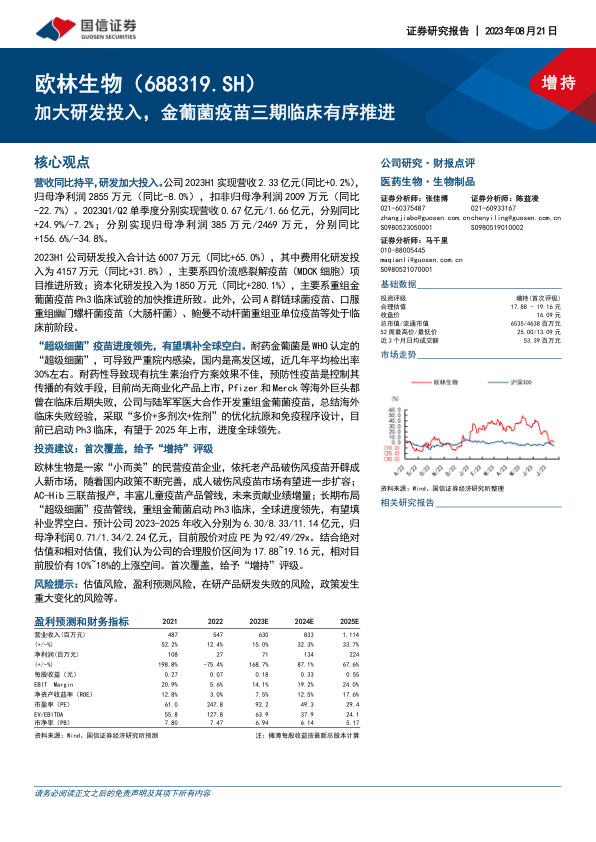 欧林生物作为一家专注于疫苗研发与生产的民营企业,在2023年上半年营收基本持平的背景下,展现出强劲的研发投入增长,特别是对重组金葡菌疫苗三期临床的加速推进。该疫苗在全球范围内处于领先地位,有望在2025年上市,填补“超级细菌”防治领域的全球市场空白,具有巨大的市场潜力。同时,公司通过成人破伤风疫苗积极拓展新市场,并计划通过AC-Hib三联苗丰富儿童疫苗管线,为未来业绩增长提供多元动力。分析师首次覆盖并给予“增持”评级,预计公司2023-2025年营收和归母净利润将实现显著增长,并指出其合理股价区间为17.88~19.16元,具备10%~18%的上涨空间。尽管公司面临估值、盈利预测、研发失败及政策变化等潜在风险,但其在创新疫苗领域的领先布局和现有产品的市场拓展能力,使其具备良好的长期投资价值。