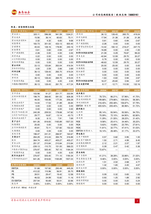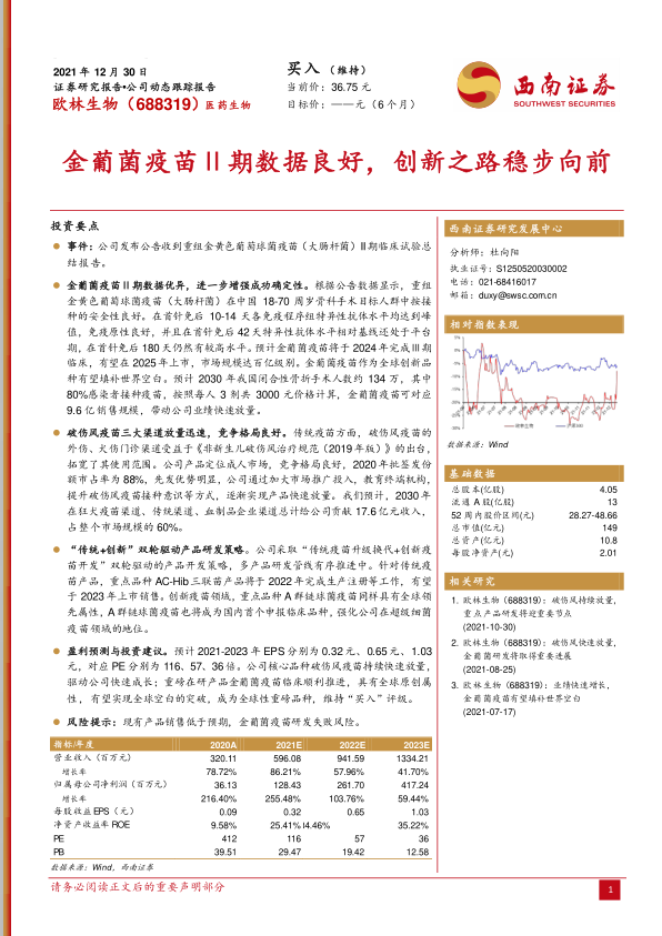 本报告分析了欧林生物的金葡菌疫苗II期临床数据,认为其数据优异,上市后有望填补全球市场空白,带来显著业绩增长。同时,公司传统疫苗业务稳健增长,多产品管线有序推进,未来发展可期。维持“买入”评级,但需注意现有产品销售低于预期和金葡菌疫苗研发失败的风险。