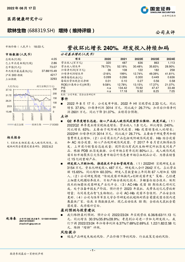 考虑到公司未来的发展前景和潜在风险,国金证券维持对欧林生物的“增持”评级,并提示投资者关注候选产品研发、产品价格和行业政策变动等风险。