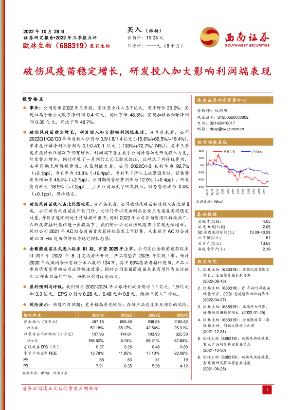 欧林生物2022年三季报显示,公司营业收入保持良好增长势头,主要得益于核心产品破伤风疫苗的稳定放量和市场拓展。尽管短期内因加大研发投入和确认所得税费用导致利润端承压,但公司在研的重组金葡菌疫苗已进入临床III期,预计2025年上市后将成为重要的业绩增长点,并具备广阔的市场潜力和国际化前景。分析师维持“买入”评级,看好公司长期发展,但同时提示了销售、竞争和研发进度等潜在风险。公司在保持核心产品优势的同时,积极布局创新疫苗管线,为未来可持续发展奠定基础。
