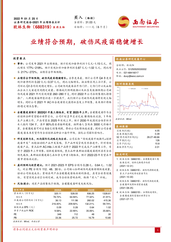 本报告对欧林生物(688319)2021年业绩预告进行了分析,并维持“买入”评级。