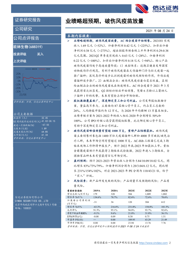 业绩略超预期,破伤风疫苗放量,AC结合疫苗开始销售。2021H1实现收入1.69亿元(+52%)、归母净利润0.42亿元(+225%)、扣非后归母净利润0.38亿元(+273%),超出招股书预告的上半年净利润0.29-0.38亿元范围。2021Q2单季度实现收入0.63亿元(+28%)、归母净利润0.22亿元(+100%)、扣非后归母净利润0.18亿元(+94%)。核心产品破伤风疫苗仍处于高速放量阶段:1)疾控体系:近期卫健委发布国家动物致伤诊疗规范,有利于破伤风疫苗在犬伤接种门诊与狂犬疫苗一起推广接种;医院急诊科逐步认识到疫苗对破伤风预防的作用,外伤后疫苗接种逐步推广。2)血制品企业:破伤风免疫球蛋白需求旺盛,直销给血制品企业的破伤风疫苗也在快速增长。AC结合疫苗于2021年3月底获得首次批签发,Q2招标补标后开始销售,凭借6月龄以上婴幼儿少接种1针的优势,未来有望抢占部分市场份额。