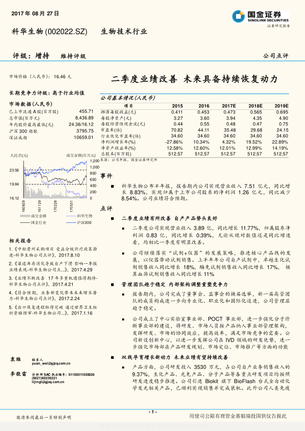 本报告对科华生物2017年二季度业绩进行了分析,指出公司业绩有所改善,自产产品销售良好,管理团队稳定,内部架构调整有助于提升竞争力。公司在产品研发和渠道流通方面均有积极举措,为未来业绩增长提供动力。报告预测了公司未来三年的盈利情况,并维持“增持”评级,同时也提示了市场推广和出口方面的风险。