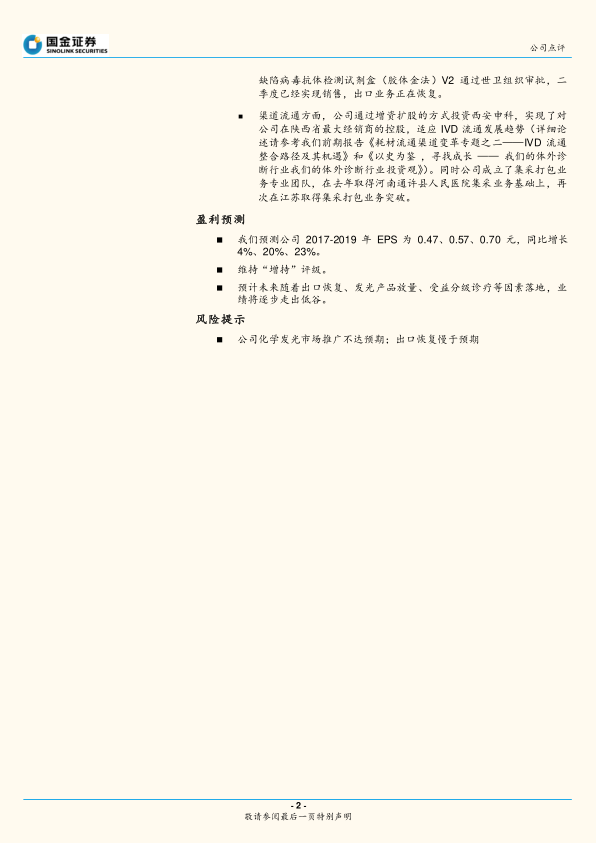 报告预测公司2017-2019年EPS,并维持“增持”评级。同时,报告也提示了公司化学发光市场推广不达预期以及出口恢复慢于预期的风险。