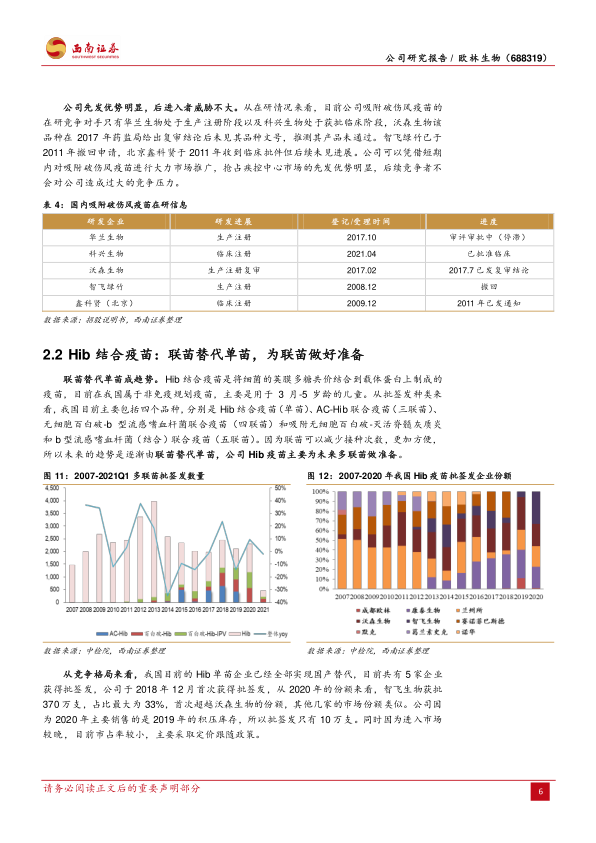 破伤风+AC-hib 竞争格局良好,多渠道+ 政策利好打开破伤风放量空间。 《非新生儿破伤风治疗规范(2019 年版)》 的出台, 大幅拓宽了破伤风疫苗使用范围。公司产品定位成人群体,随着狂犬病毒暴露患者疫苗接种渗透率的提升(预计2030 年狂苗接种者破伤风接种渗透率达到 1 /3 )以及被动免疫制剂患者渗透率的提升(预计 2030 达到 15%),行业市场规模在 2030 年可达到 29.3 亿元。目前公司的竞争对手只有武汉生物所, 2020 年公司批签发份额占比为 88 %,先发优势明显; 考虑未来市场竞争, 我们预计, 2030 年在狂犬疫苗渠道、传统渠道、血制品企业渠道总计给公司贡献 17.6 亿元收入, 占整个市场规模的 60 %。 公司AC-Hib 产品正处于 III 期临床,是国内仅有的 2 个在研产品之一,预计 2023 年上市,有望成为公司第二个 10 亿级品种。我们认为,破伤风+AC-Hib 组合未来将贡献超过 25 亿元的峰值收入,稳定贡献超 5 亿元的业绩。