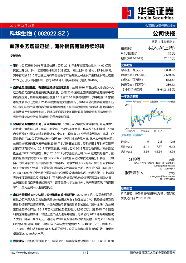 本报告分析了科华生物(002022.SZ)2016年的业绩快报,指出公司血筛业务的迅猛增长是营收的主要驱动力,且该业务具有稳定性和可持续性。同时,公司在化学发光领域的布局和海外市场的拓展,有望成为未来业绩增长的新引擎。